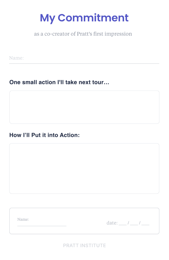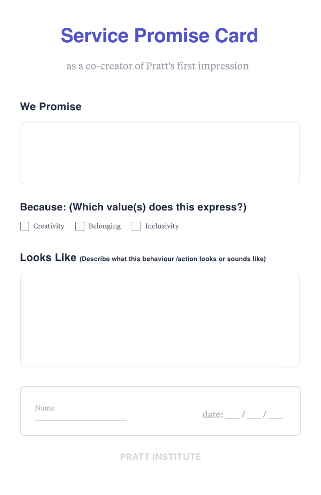 It's a card where ambassadors write a "We Promise" statement to visitors and then describe how they will keep that promise in real life, focusing on Pratt's values (creativity, belonging, and inclusivity).