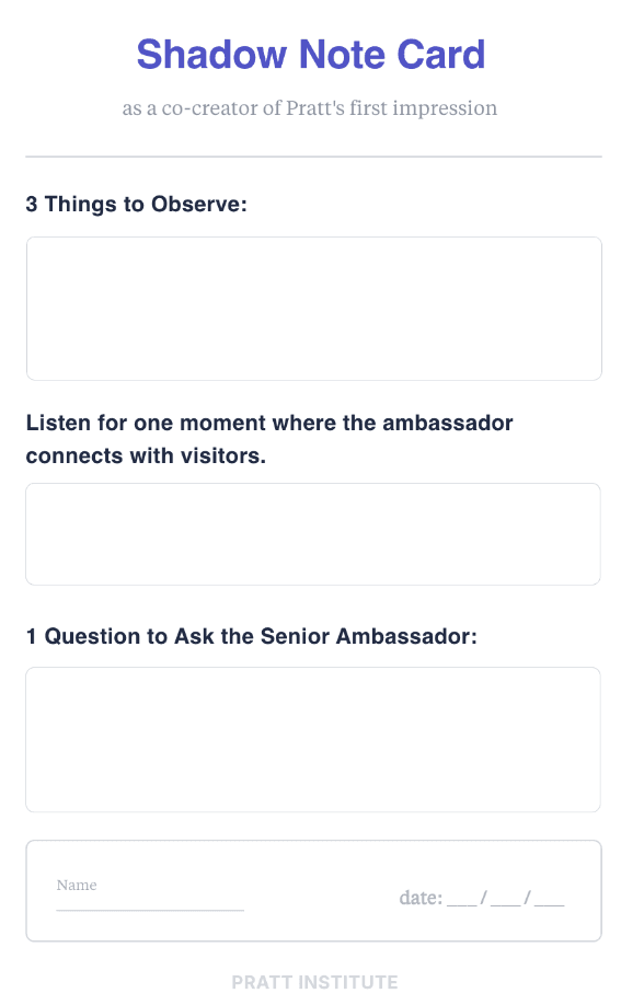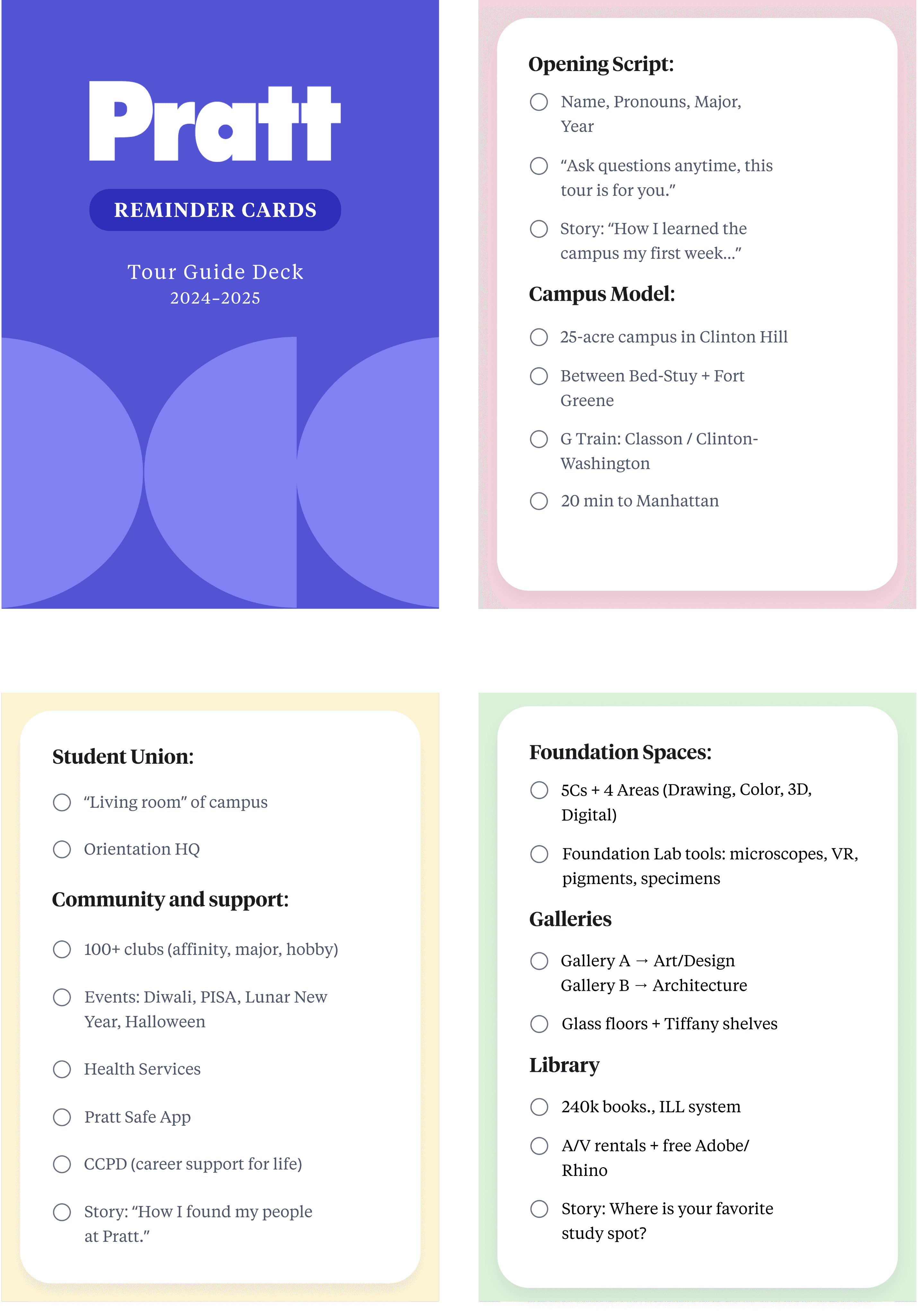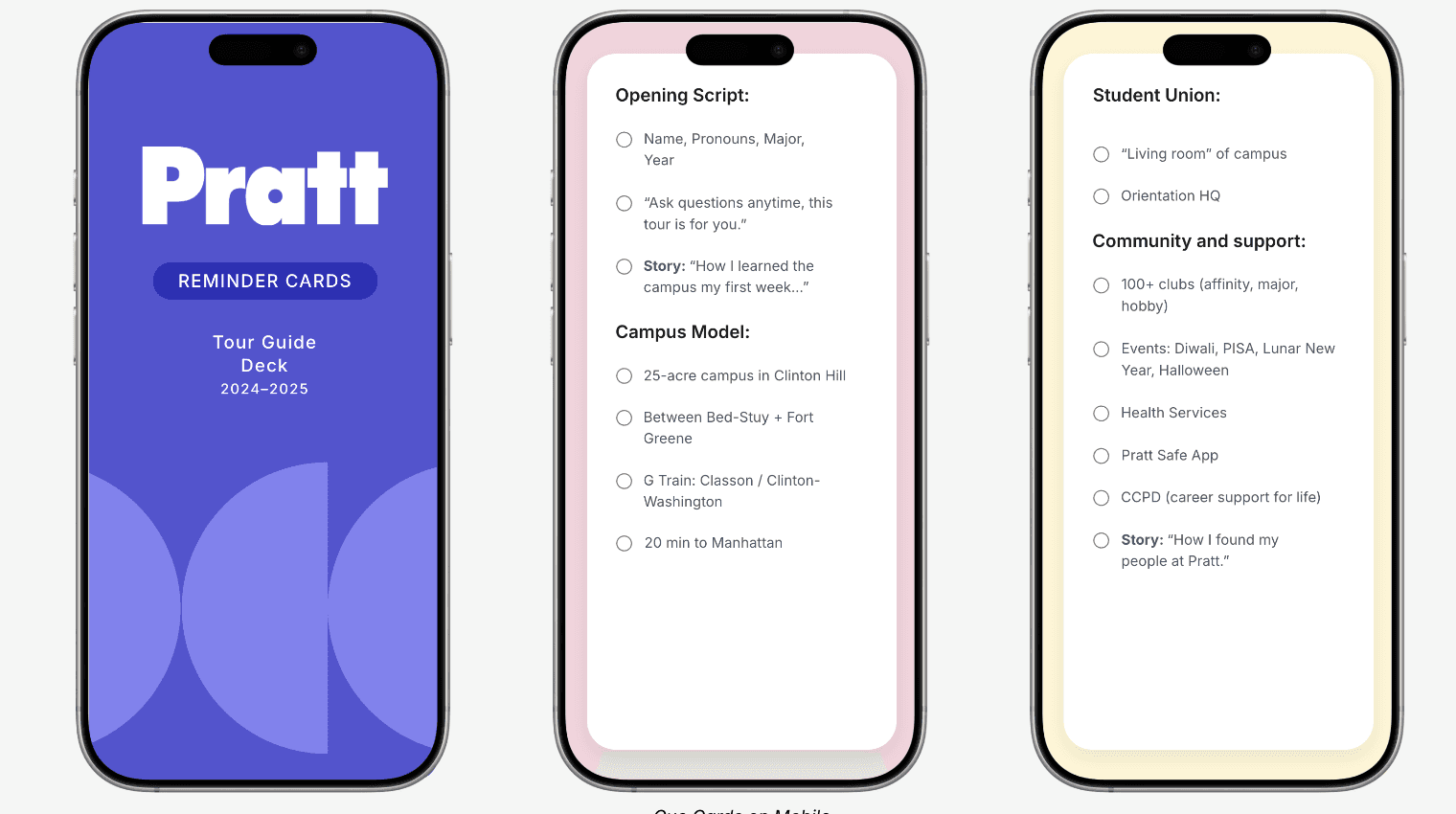 The final interventions focused on strengthening the system rather than adding complexity—providing clearer structure for ambassadors, better orientation for visitors, and more reliable information flow across teams. Together, these changes support a more predictable, inclusive, and consistent visitor experience while preserving the human warmth that already exists within Pratt Admissions.
