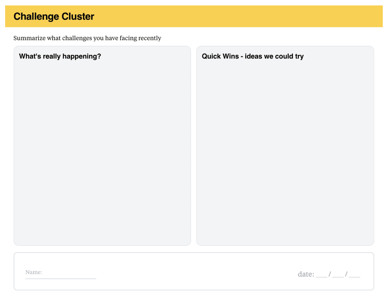 This worksheet helps ambassadors, right after they reflect, to list their tour challenges, discover why those problems are happening, and suggest quick, simple solutions. It was added so the team can better understand issues and make fast improvements.
